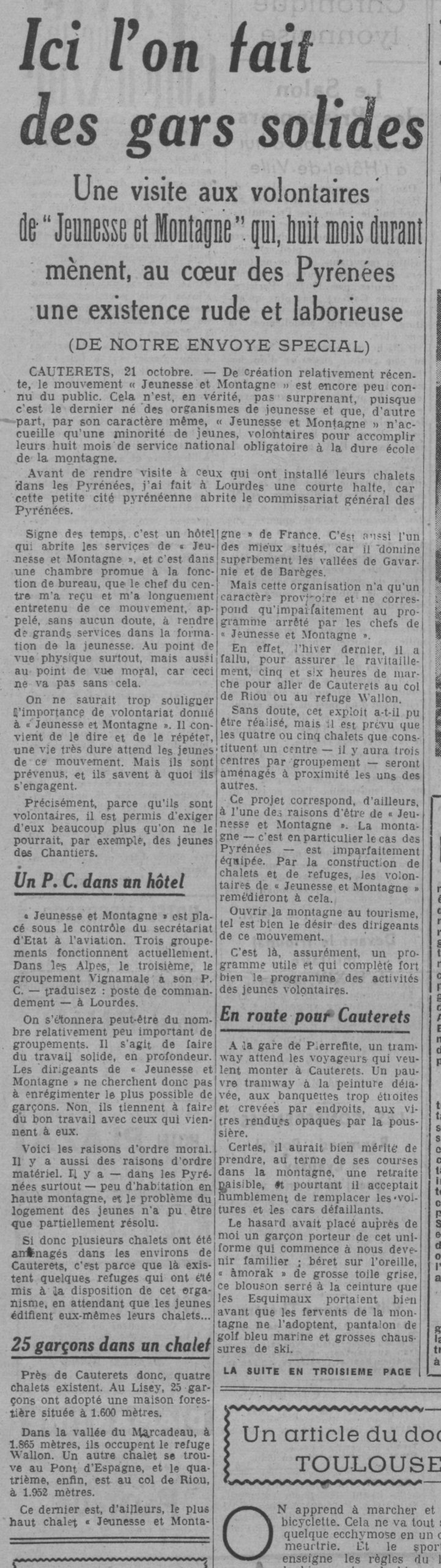 « Jeunesse et Montagne » est placé sous le contrôle du secrétariat d’Etat à l’aviation. Trois groupements fonctionnent actuellement. Dans les Alpes, le troisième, le groupement Vignamale a son P. C. — traduisez : poste de commandement — à Lourdes.