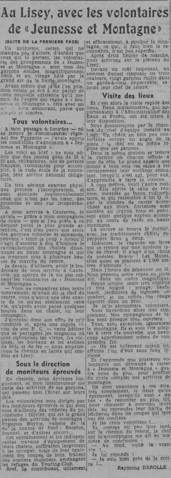 On ne saurait trop souligner d’importance de volontariat donné à «’ Jeunesse et Montagne ». Il convient de le dire et de le répéter, une vie très dure attend les jeunes de ce mouvement. Mais ils sont prévenus, et ils savent à quoi ils s’engagent.