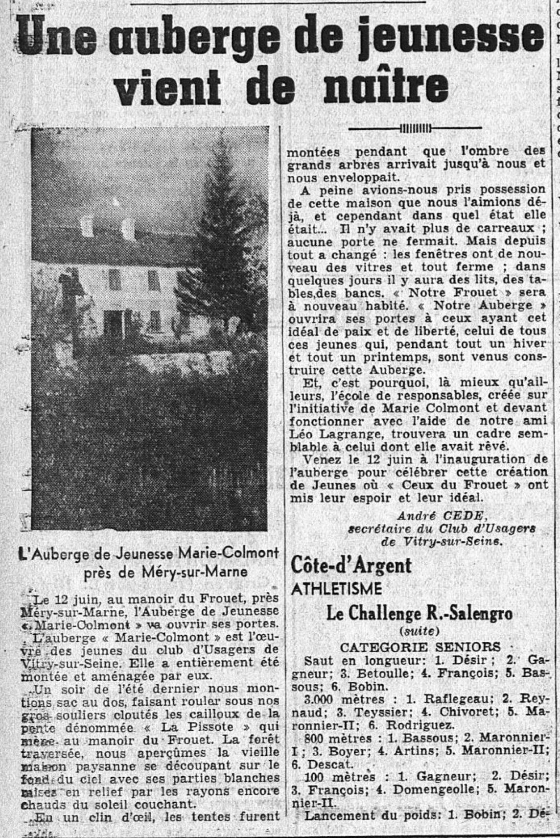 Le 12 juin, au manoir du Frouet, près Méry-sur-Marne, l’Auberge de Jeunesse « Marie-Colmont » va ouvrir ses portes. L’auberge « Marie-Colmont » est l’œuvre .des jeunes du club d’usagers de Vitry-sur-Seine. Elle a entièrement été montée et aménagée par eux.