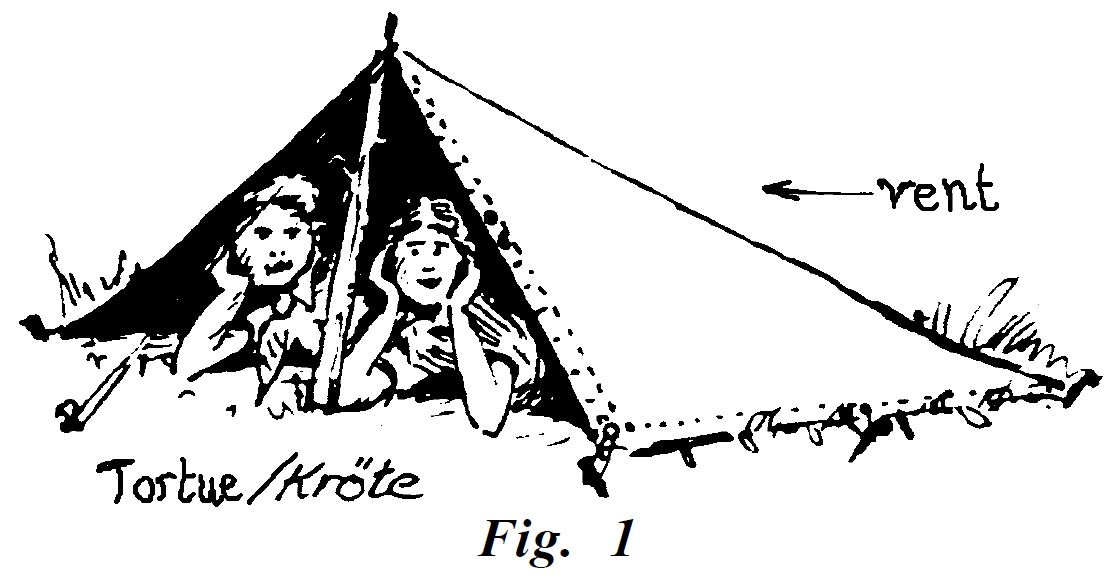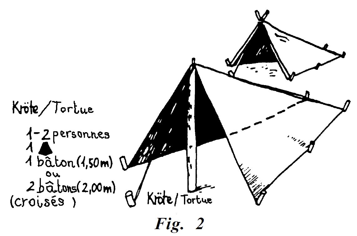 Le poncho n’est normalement pas nécessaire si vous faites attention à l’orientation du vent – ainsi il ne pourra pas pleuvoir à l’intérieur de votre abri. pour consolider davantage la tension de la toile, il est conseillé aussi de planter un piquet à 1,50 m en face de l’entrée, et d’y tendre une corde passée autour de la pointe du bâton vertical. Au lieu d’un seul bâton, on peut aussi disposer deux bâtons croisés le long des ouvertures (voir Fig. 2), ce qui permet de rentrer et sortir plus facilement de la tente.