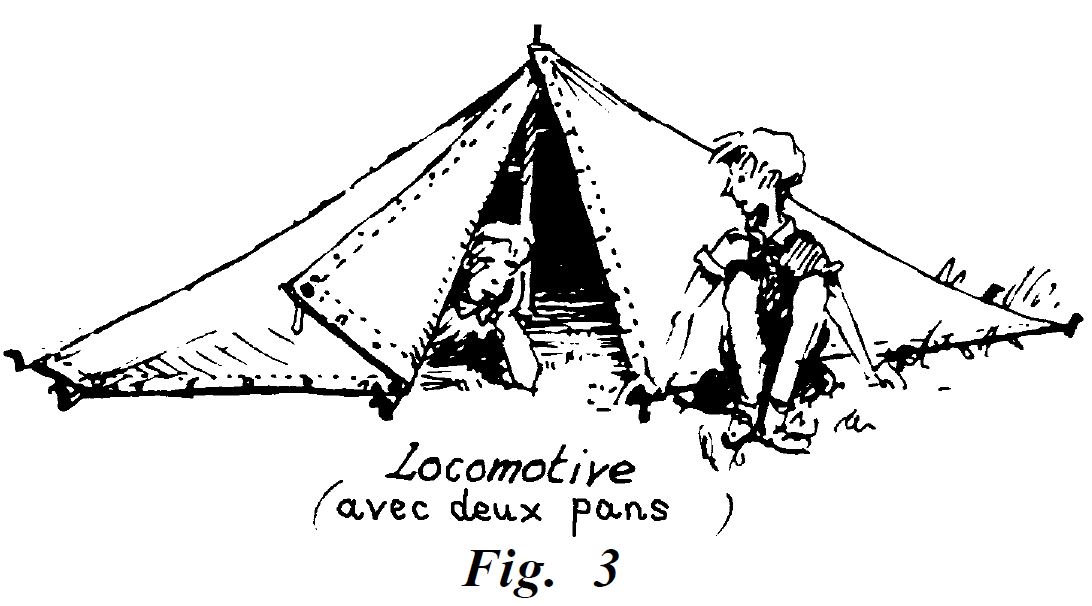 Si vous possédez deux pans, vous pouvez fabriquer un abri pour deux ou trois personnes : la Locomotive (ne me demandez pas d’où vient ce terme!). Étalez les deux pans avec les plus grandes longueurs côte à côte. Ensuite boutonnez les deux ensemble (le bouton d’un dans le trou de l’autre et vice et versa afin d’avoir une plus grande solidité). Trouvez un bâton d’environ un mètre et procédez comme précédemment, votre bâton sera maintenant au centre de votre tente. Fixer ensuite les deux extrémités latérales avec des piquets, puis les quatre extrémités avant et arrière, et cela devrait ressembler à l’image ci-contre (Fig. 3).