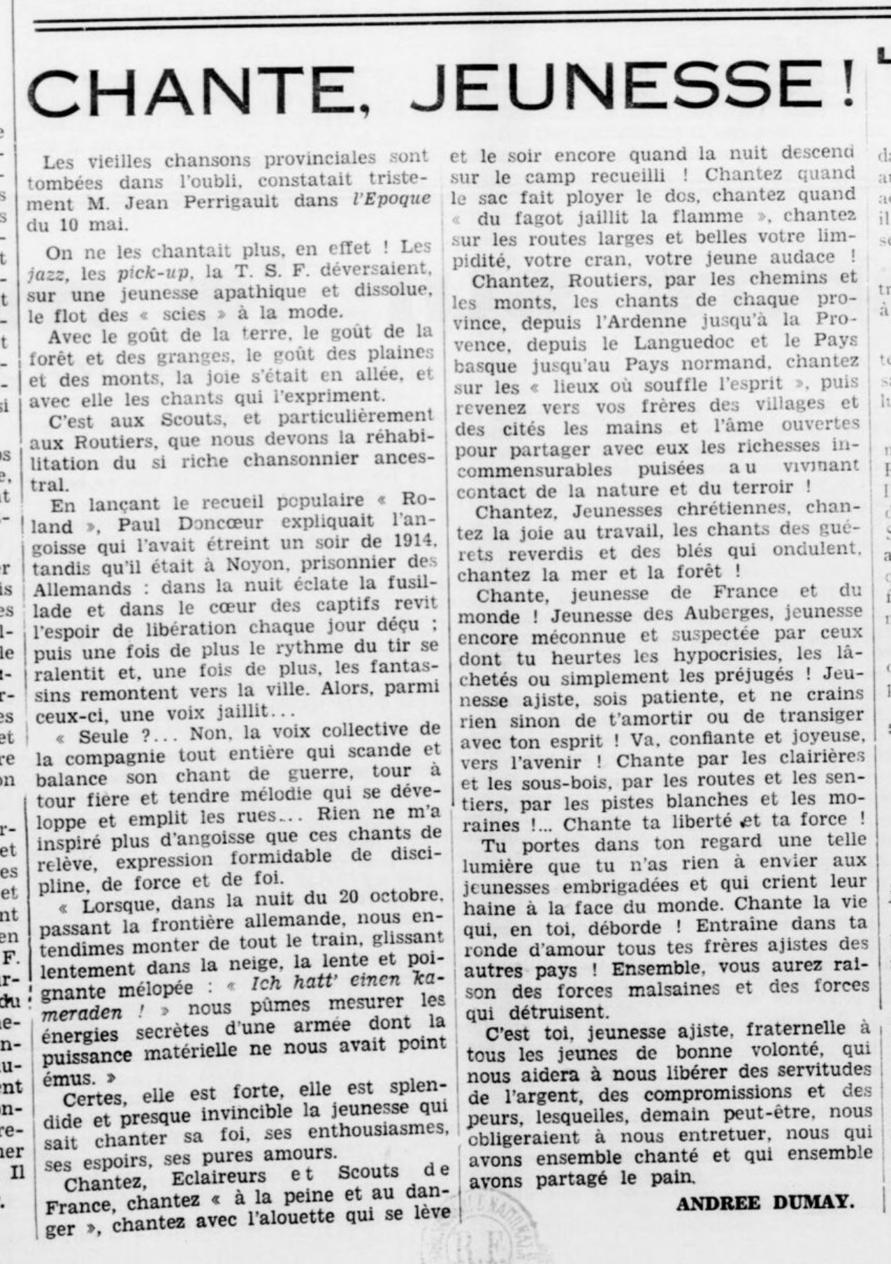 Chantez, Eclaireurs et Scouts de France, chantez « à la peine et au danger », chantez avec l’alouette qui se lève et le soir encore quand la nuit descend sur le camp recueilli ! Chantez quand le sac fait ployer le dos, chantez quand du fagot jaillit la flamme, chantez sur les routes larges et belles votre limpidité, votre cran, votre jeune audace !
