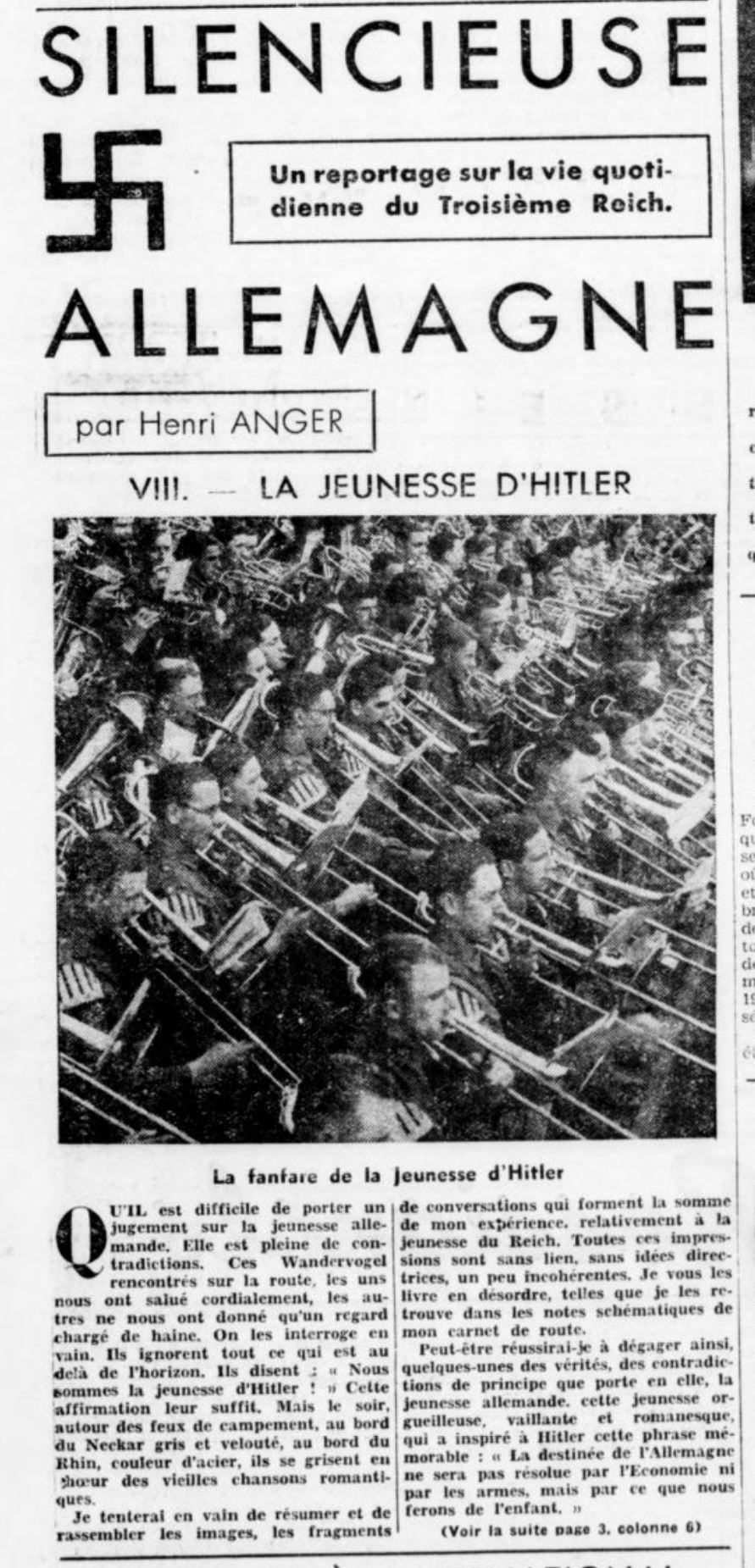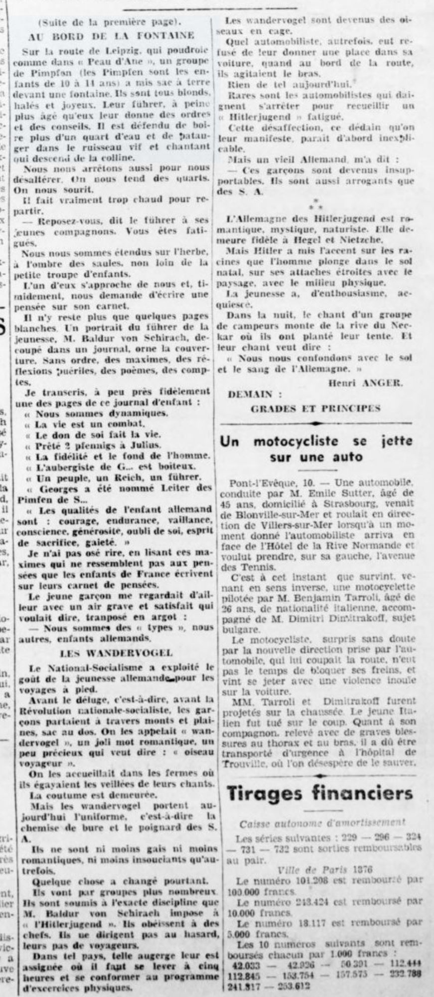 Qu’il est difficile de porter un jugement sur la jeunesse allemande. Elle est pleine de contradictions. Ces Wandervögel rencontrés sur la route, les uns nous ont salués cordialement, les autres ne nous ont donné qu’un regard chargé de haine. On les interroge en vain. Ils ignorent tout ce qui est au-delà de l’horizon. Ils disent ; « Nous sommes la jeunesse d’Hitler ! » Cette affirmation leur suffit. Mais le soir, autour des feux de campement, au bord du Neckar gris et velouté, au bord du Rhin, couleur d’acier, ils se grisent en chœur des vieilles chansons romantiques.