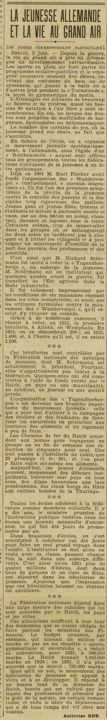 Berlin, 5 juin. — Depuis la guerre, la vie au grand air a pris en Allemagne un développement extraordinaire. Des sports en plein air font partie du programme scolaire quotidien et le voyageur rencontre souvent des élèves, revêtant des costumes de bain ou de gymnaste, qui jouent à la balle ou à d’autres jeux pendant la « Turnstunde », la leçon de gymnastique du matin.