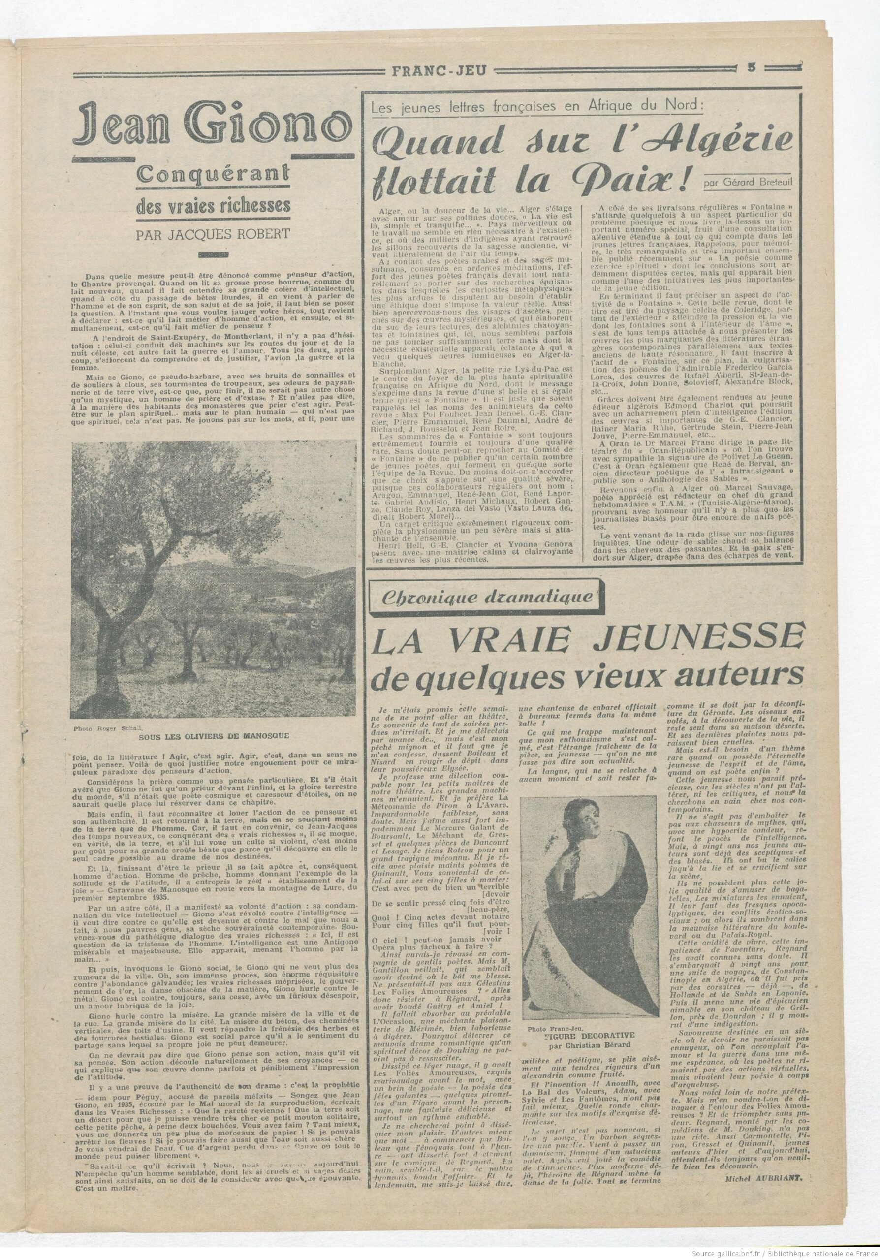Par un autre côté, il a manifesté sa volonté d’action : sa condamnation du vice intellectuel. Giono s’est révolté contre l’intelligence — il veut dire contre ce qu’elle est devenue et contre le mal que nous a fait à nous pauvres gens, sa sèche souveraineté contemporaine. Souvenez-vous du pathétique dialogue des vraies richesses : « Ici, il est question de la tristesse de l’homme. L’intelligence est une Antigone misérable et majestueuse. Elle apparaît, menant l’homme par la main… »