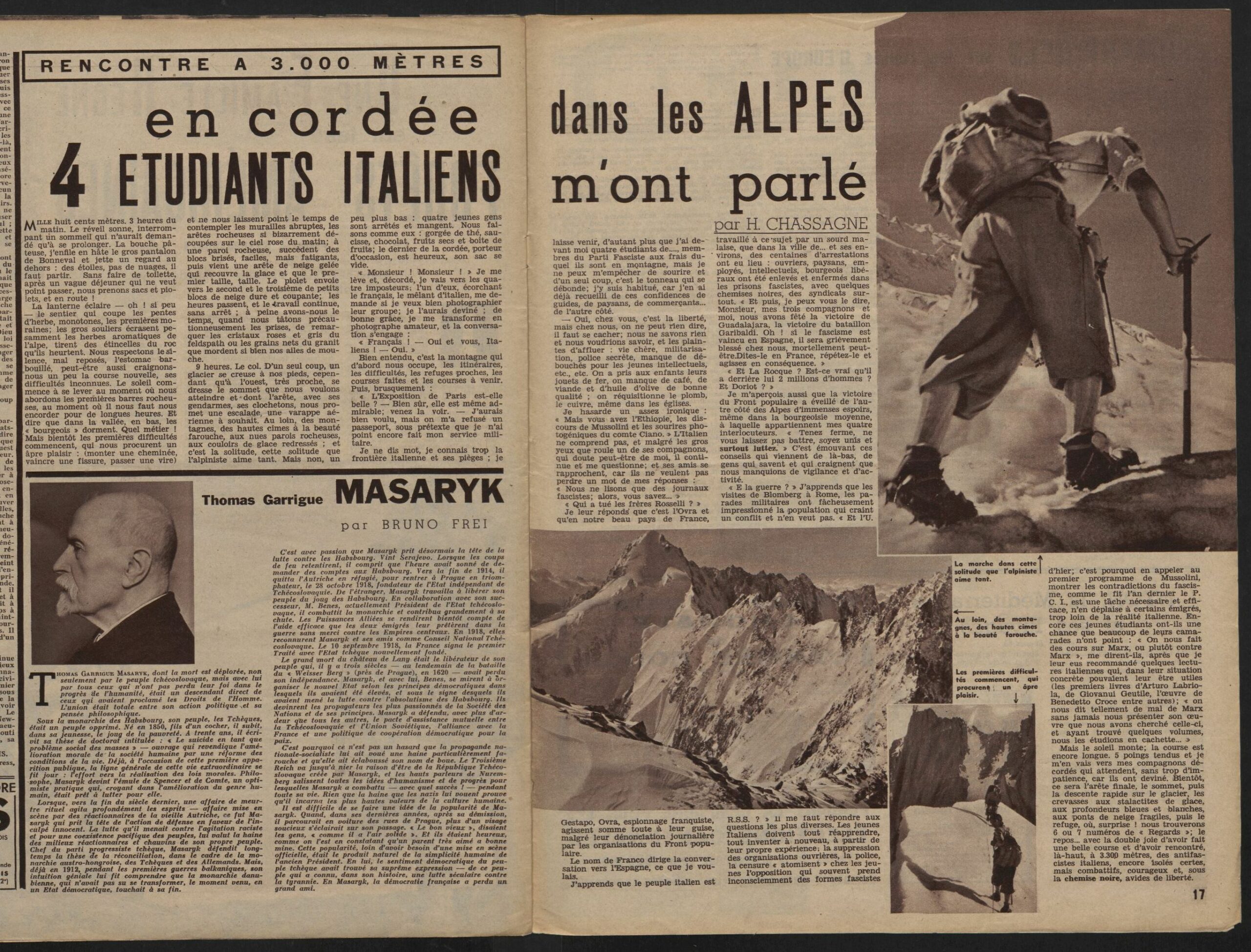 Mais le soleil monte ; la course est encore longue. 5 poings tendus et je m’en vais vers mes compagnons décordés qui attendent, sans trop d’impatience, car ils ont deviné. Bientôt, ce sera l’arête finale, le sommet, puis la descente rapide sur le glacier, les crevasses aux stalactites de glace, aux profondeurs bleues et blanches, aux ponts de neige fragiles, puis le refuge, où, surprise ! nous trouverons 6 ou 7 numéros de « Regards » ; le repos… avec la double joie d’avoir fait une belle course et d’avoir rencontré, là-haut, à 3.300 mètres, des antifascistes italiens, encore isolés certes, mais combattifs, courageux et, sous la chemise noire, avides de liberté.
